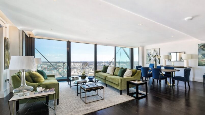 This stunning penthouse apartment offers the ultimate riverside living experience, featuring breathtaking, panoramic views of the River Thames and the iconic London skyline. Spread across two luxurious floors, the upper level boasts a spacious, open-plan reception and dining room with floor-to-ceiling windows that flood the space with natural light while showcasing the spectacular vistas. The living area opens onto a generous balcony that spans the width of the apartment, creating the perfect space for enjoying the views. The fully equipped, state-of-the-art kitchen includes ample storage and premium Miele appliances. A guest WC is also conveniently located on this floor.